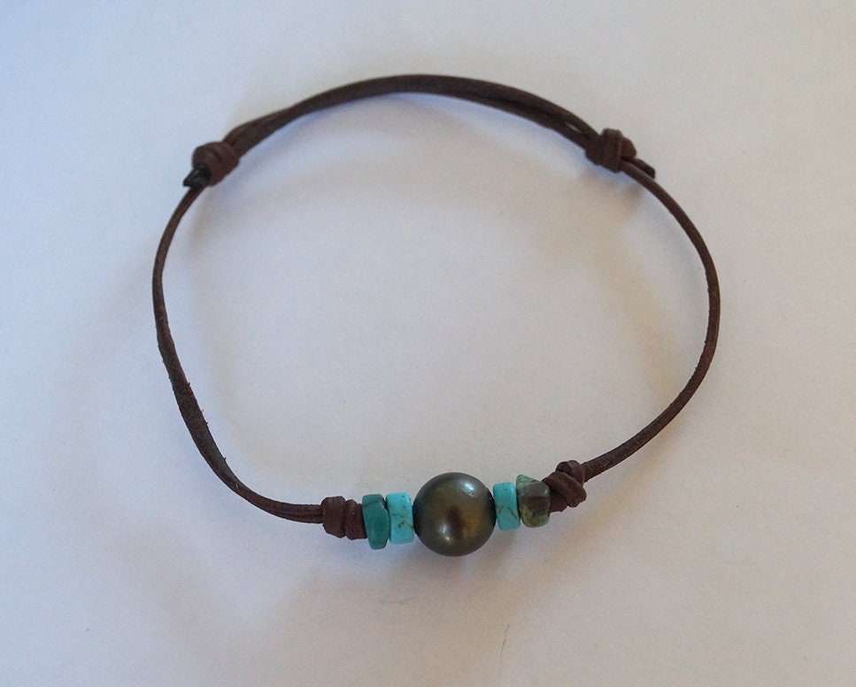 Genuine Tahitian pearl and small green turquoise pearls for an adjustable bracelet.