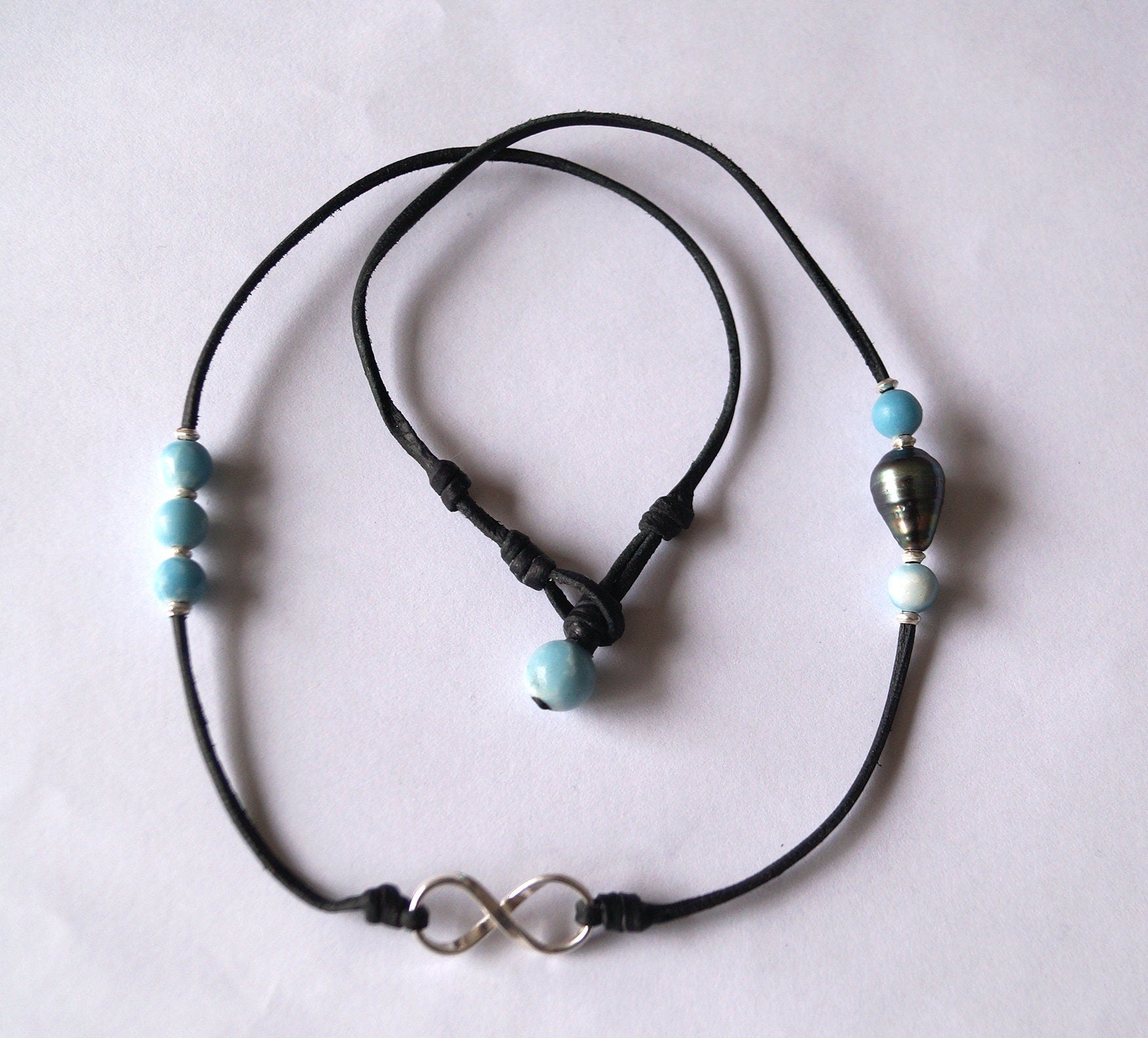 Women's choker necklace with Tahitian pearl, Larimar pearls, and infinity sign