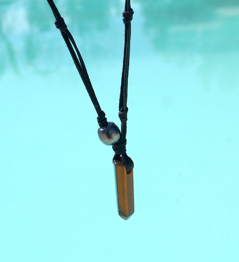 Choose the stone for your pendant for this men's black leather necklace with its Tahitian pearl.