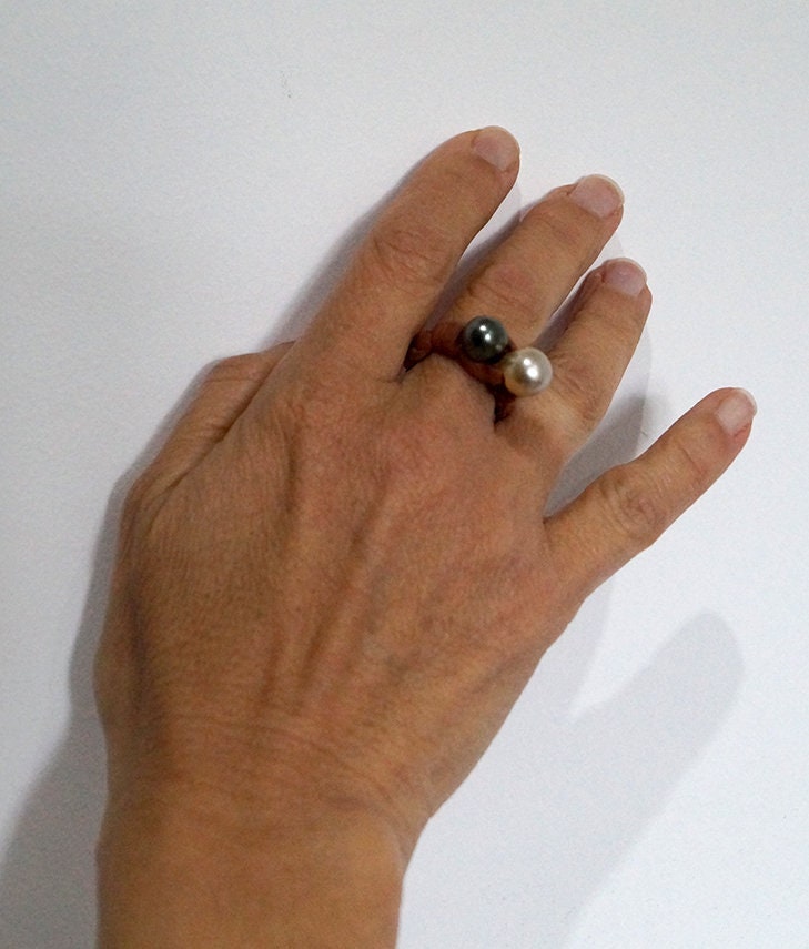 Bague femme en cuir tressé avec son duo de perles contrastées. La bague est composée de :