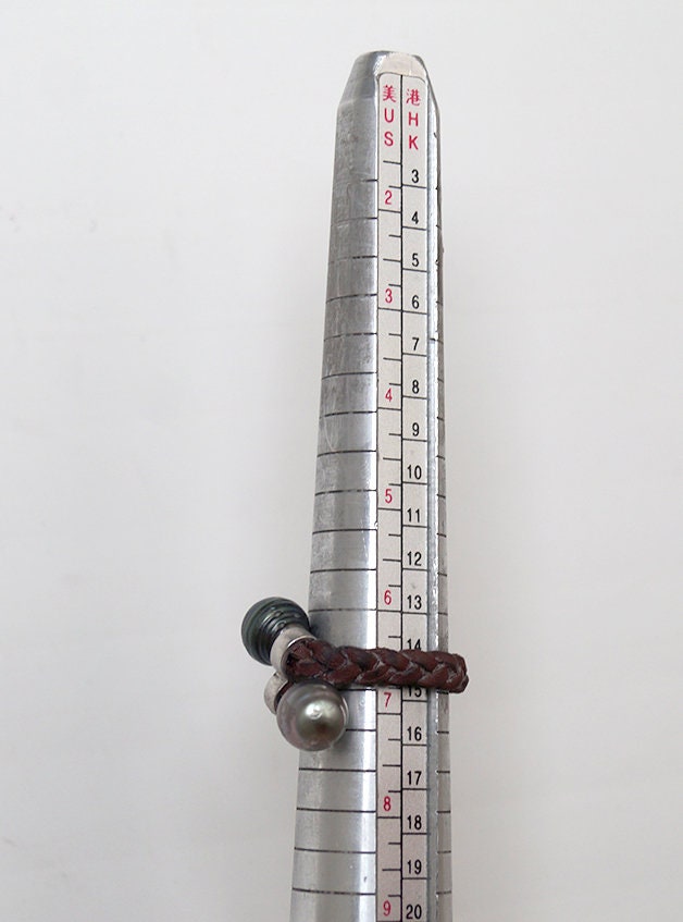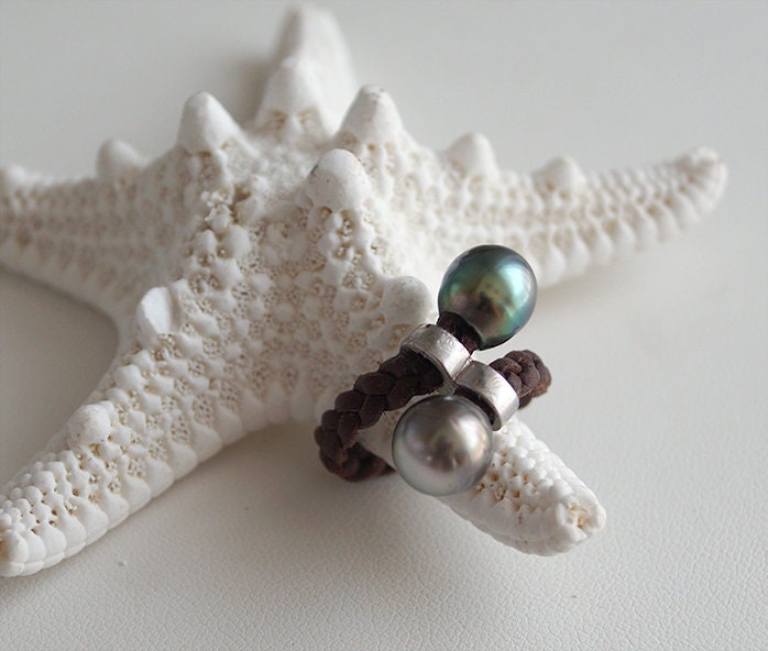 Bague cuir tressé avec duo de perles de Tahiti - Helle
