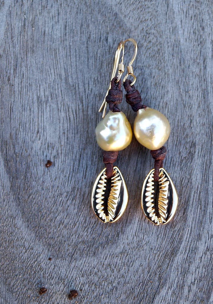 Boucles d'oreilles en perles Australiennes dorées et coquillages cauri - Gloria