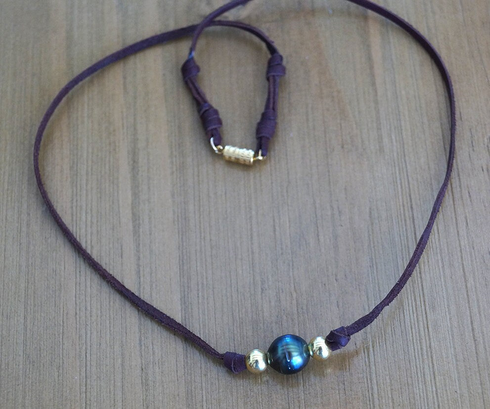 Collier femme en sobriété avec sa perle de Tahiti paon et des perles dorées montées sur cuir brun. Le bijou est composé de :
